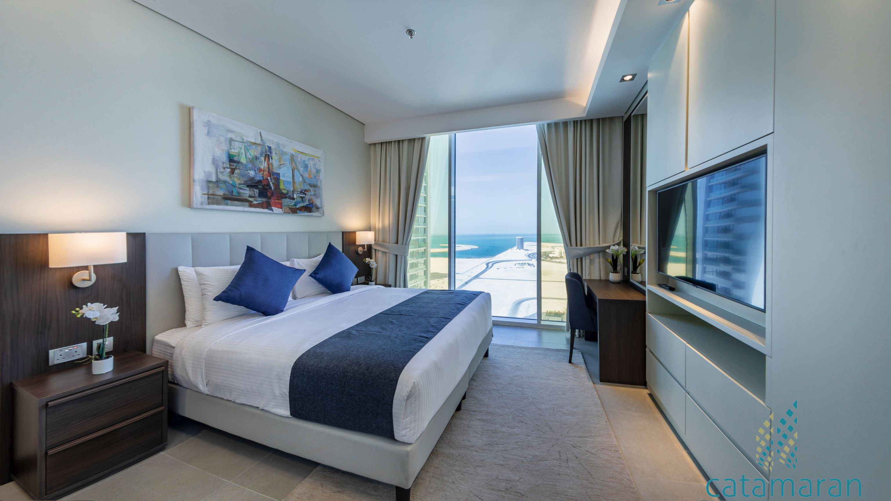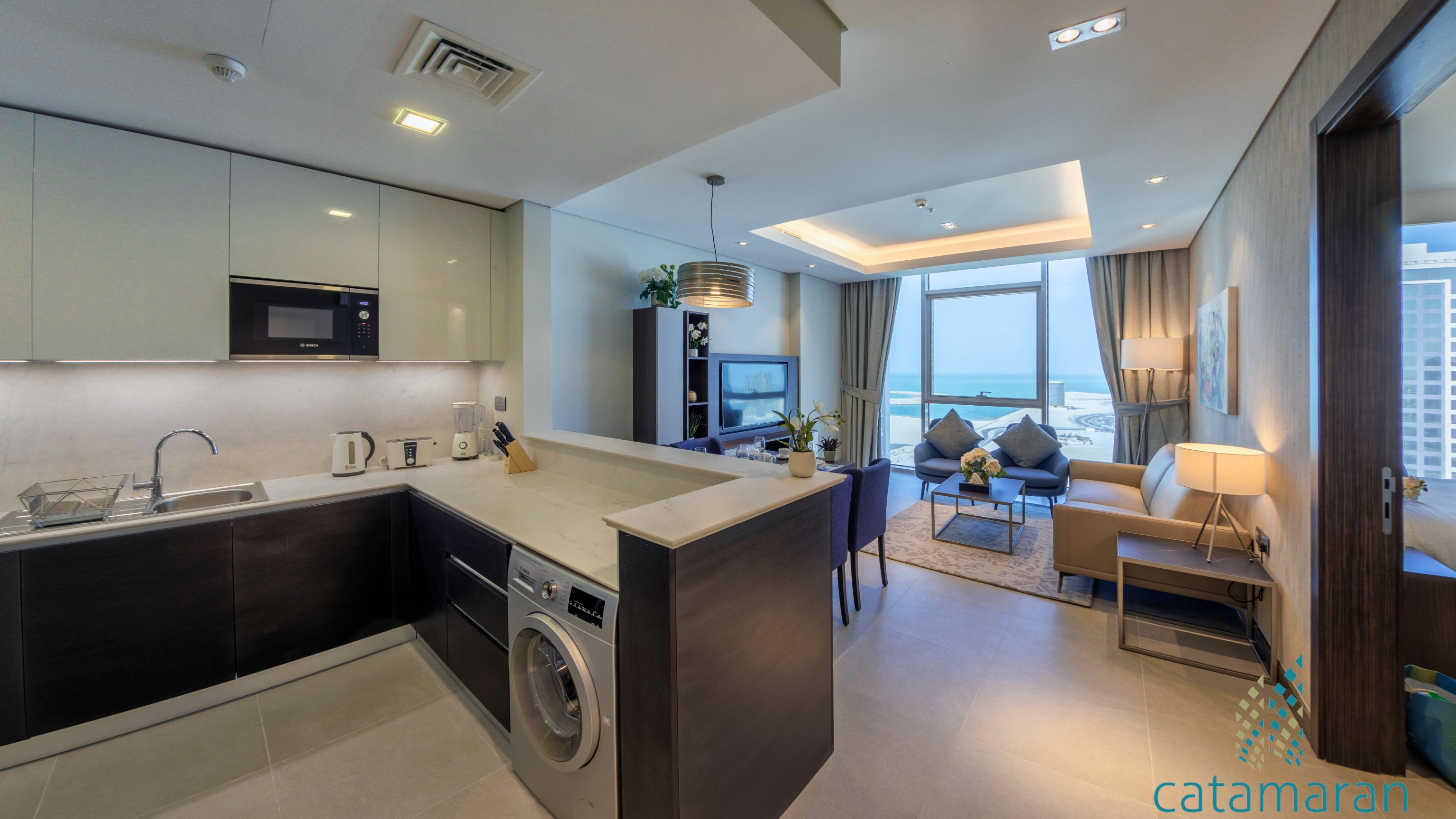 Brand new luxury 1 bedroom and study room apartment located in the heart of Seef District in Bahrain's latest high-rise building and one of it's most luxurious new developments, Catamaran Towers.